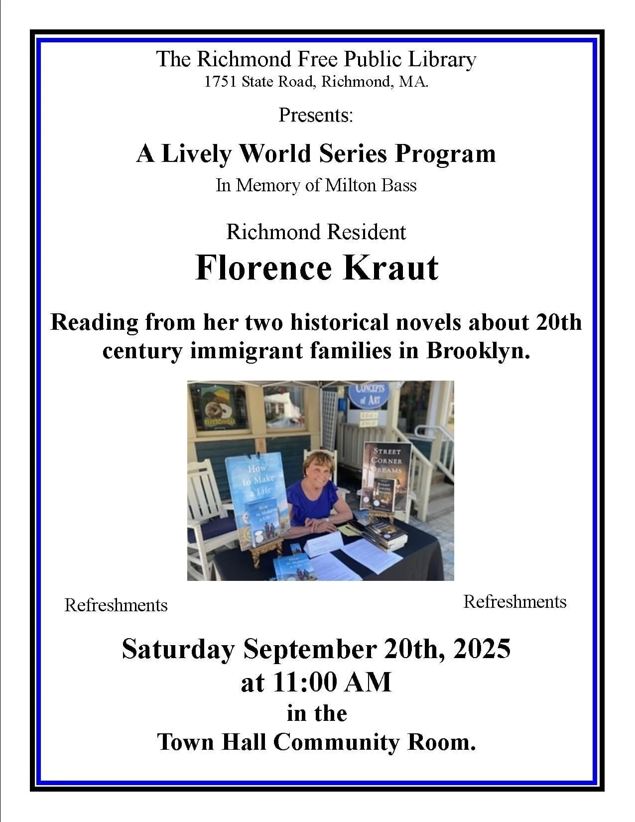 Join me online with the Osher Lifelong Learning Institute at Berkshire Community College as I officially launch Street Corner Dreams on Tuesday, November 14 at 7pm. The evening will include an interview with the author conducted by Nora Stonehill and readings from the book by Justine Reiss, audio narrator, voiceover coach, and talent. Register HERE!